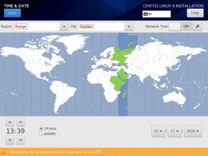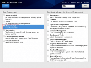 SOFTWARE SELECTİON bölümünde sunucunuz üzerine kurulacak olan görev ve uygulamalar seçilir. Base Environment kısmında kuracağınız bilgisayar türü seçilir. Bu adımda minimal install seçeneğini işaretleyeceğiz ve Done butonuna basarak devam edeceğiz.