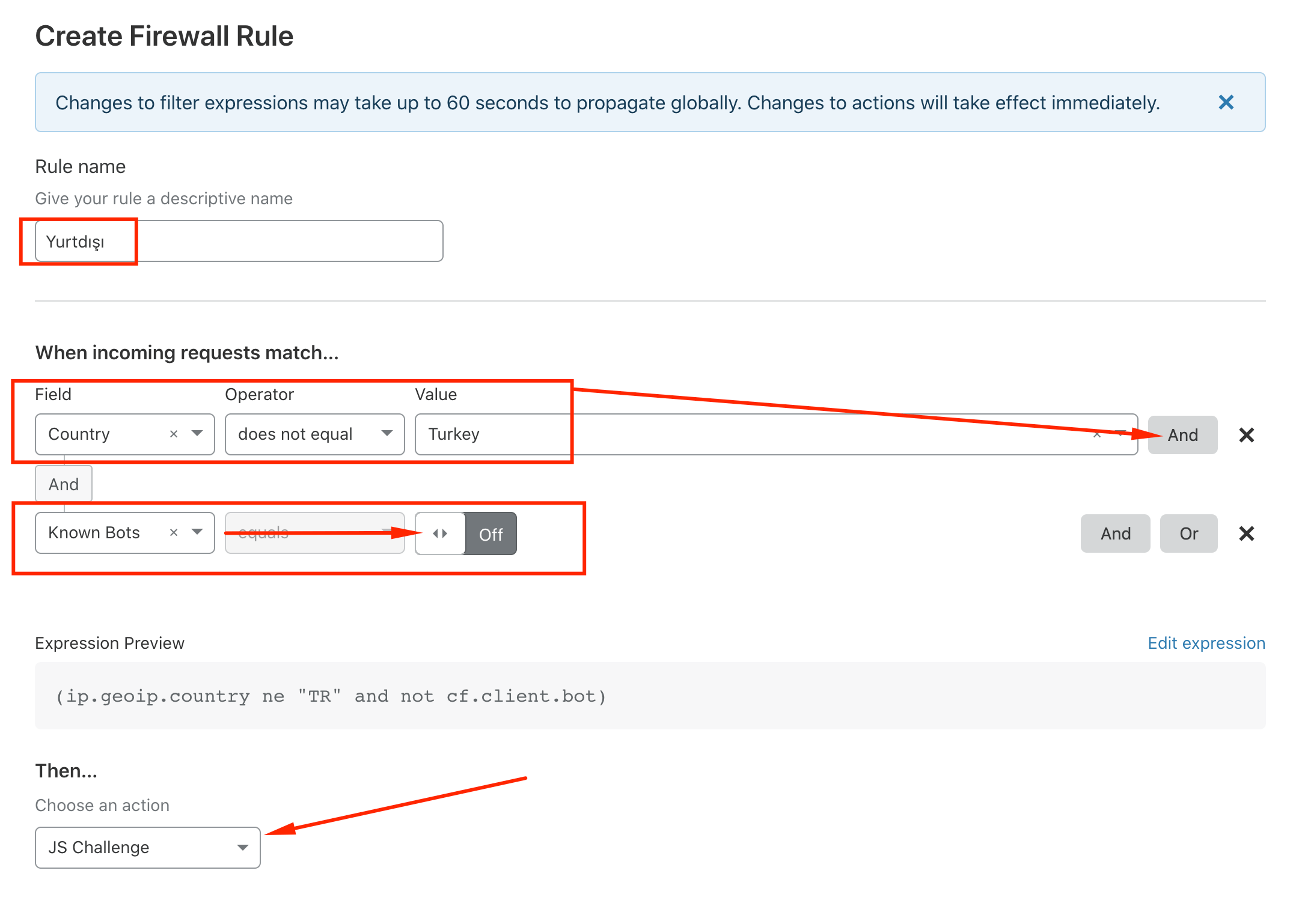 Alt kısımda yer alan Then… karşılığına ise atak çok fazla geliyor ise Challange (Captcha) eğer olağan düzeyde ise JS Challange seçeneğini seçin.