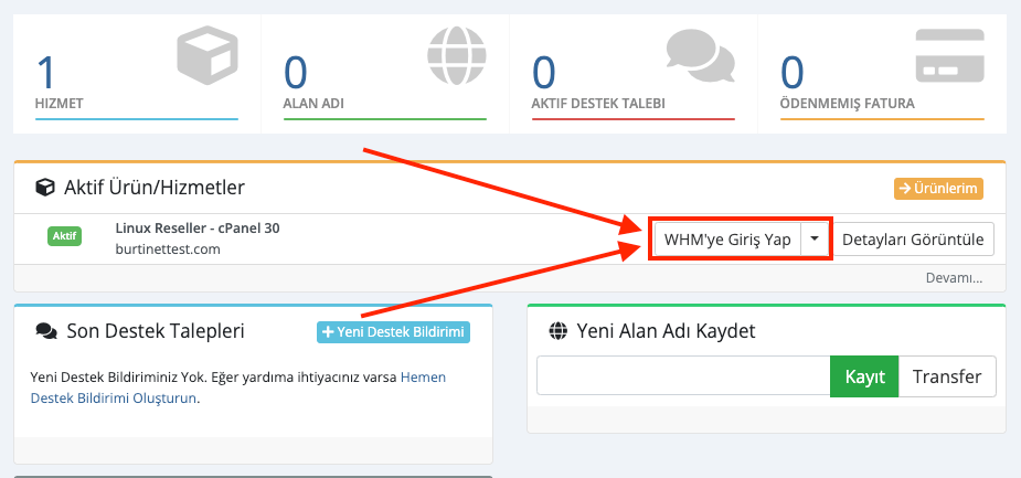 • https://sunucuadres.com:2087/ üzerinden WHM hizmetinize giriş yapabilirsiniz. Giriş bilgileri ve giriş URL adresi satın alma işlemi sonrasında otomatik mail adresinize gönderilmiş olacaktır. Giriş bilgilerinizi mail adresinizde bulamazsanız yukarıdaki adımları takip ederekte giriş yapabilirsiniz. Bilgilerinizi öğrenmek için talep açabilirsiniz.