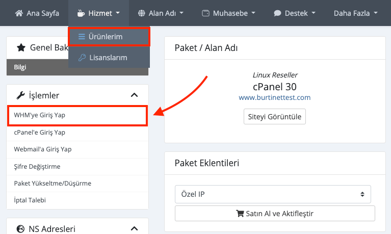 • my.burinet panelinde yer alan menüden Hizmet > Ürünlerim alanına geçiş yapınız. WHM üzerinden oturum açmak istediğiniz hizmetin üstüne tıklayın. Hizmet detay sayfasına giriş yaptıktan sonra sol tarafta İşlemler sekmesi altında WHM’ye Giriş Yap butonuna tıklayarak hizmetinize giriş yapabilirsiniz.