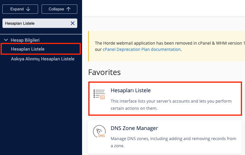 • WHM üzerinde oturum açtıktan sonra sol tarafta arama kısmına Hesapları Listele (List accounts) yazınız. Genellikle oturum açtıktan sonra Favorites kısmından da bu alana hızlıca erişim sağlayabilirsiniz.