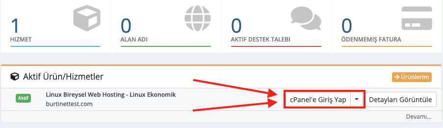 • Burtinet üzerinde tekli hosting hizmetiniz bulunuyorsa yine my.burtinet paneli Ana Sayfası üzerinde yer alan Aktif Ürün/Hizmetler kısmında giriş yapmak istediğiniz hizmeti bulunuz. Sağ tarafında cPanel‘e Giriş Yap butonuna tıklayarak Hosting hizmetinize giriş yapabilirsiniz.