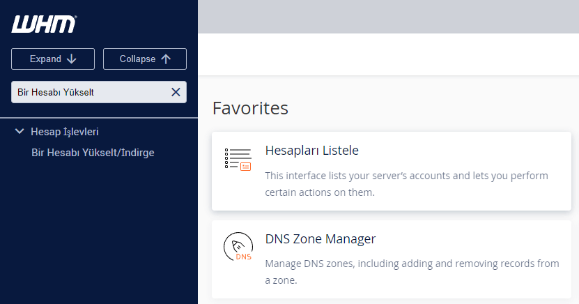 - Bir Hesabı Yükselt Alanına Giriş Yapın: WHM kontrol panelinizin sol tarafında yer alan arama kısmına Bir Hesabı Yükselt/İndirge ( Upgrade/Downgrade an Account) yazın ve ilgili alana giriş yapınız.