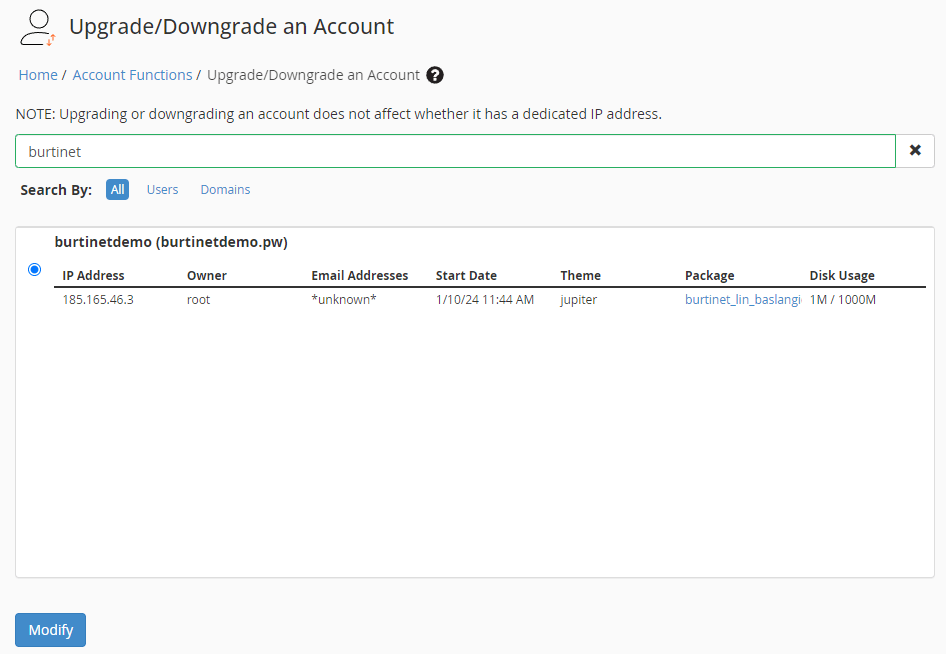 - Düzenlemek istediğiniz Kullanıcıyı Seçin: Bir Hesabı Yükselt/İndirge ( Upgrade/Downgrade an Account) alanında paketini değiştirmek istediğiniz kullanıcı hesabını bulun ve başında yer alan checkbox ‘a tıklayarak seçtiğinizden emin olunuz. Modify butonuna tıklayıp devam edin.