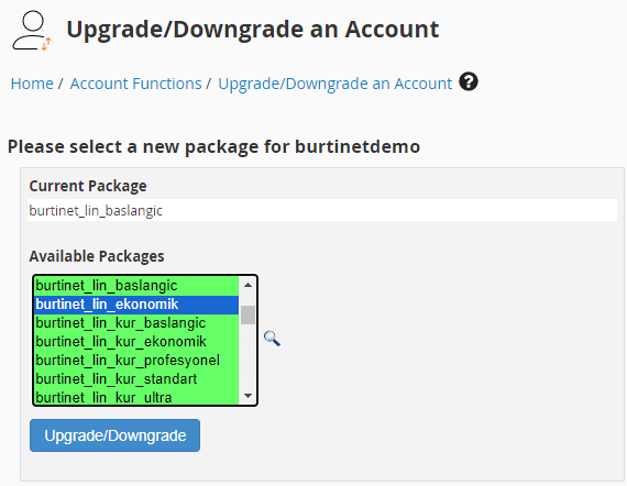 - Paket Seçin: İşlem yaptığınız kullanıcının paketini hangi paketle değiştirmek istiyorsanız seçin ve Upgrade/Downgrade yazan butona tıklayıp kaydedin. Paket değiştirme işlemi bu kadardır.