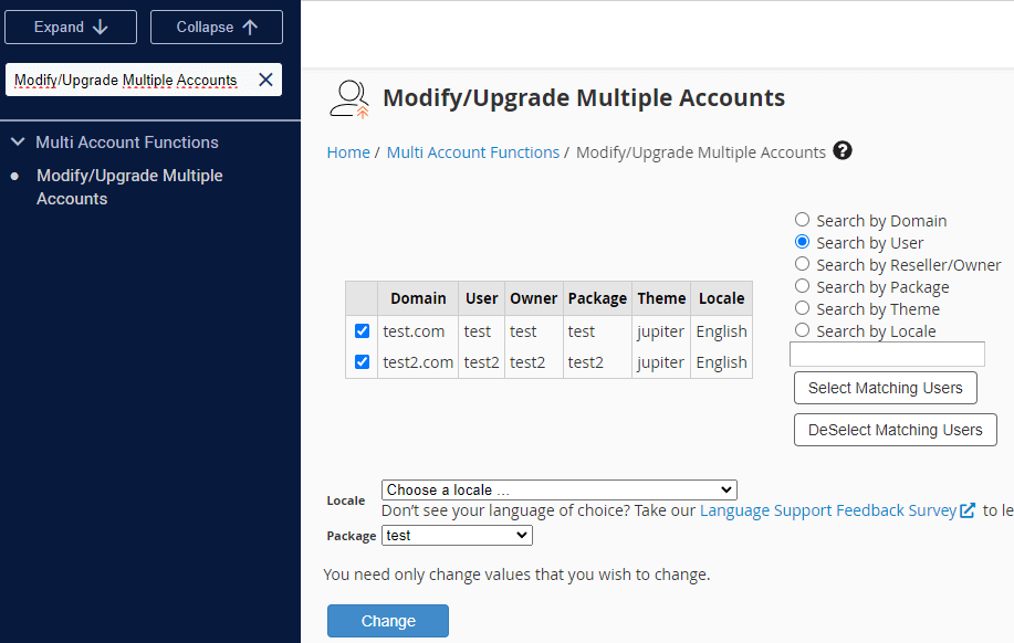 - Toplu Kullanıcı Paketi Değiştirme: Toplu olarak kullanıcı paketlerini güncellemek için Sol tarafta arama kısmına Birden Çok Hesap Değiştir/Yükselt (Modify/Upgrade Multiple Accounts) yazın ve tıklayarak geçiş yapınız. Sonrasında paketini değiştirmek istediğiniz kullanıcı hesaplarını seçiniz. En alt kısımda Package alanından yapmak istediğiniz paketi seçip Change butonuna tıklayarak kaydedin. Bu şekilde toplu olarak kullanıcı paketlerinizi güncellemiş olacaksınız.