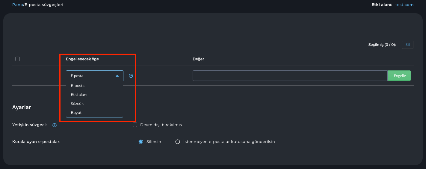 2 – Öncelikle engellenecek öğeyi seçiyoruz. Bu kısımdan E-posta (E-mail) , Etki alanı (Domain), Sözcük (Stop word) veya Boyut (Size) gibi alanlara filtre oluşturabilirsiniz.
