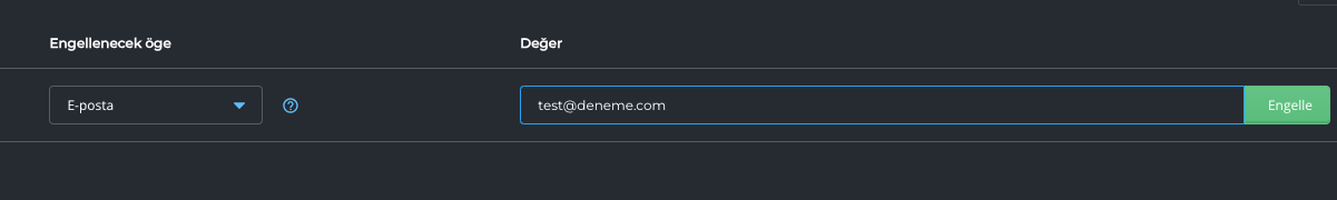 3 – SPAM Maili gönderen bir mail adresi varsa eğer E-posta (E-mail) seçeneğini seçiniz. Değer (Value) kısmına ise SPAM mail gönderen mail adresini giriniz ve Engelle (Block) butonuna basınız.