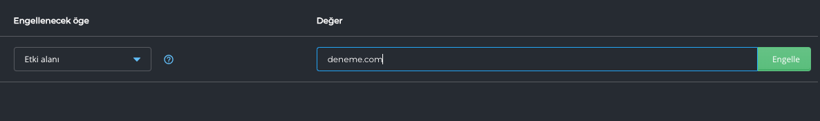 4 – Aynı alan adına sahip farklı mail adreslerinden SPAM mail alıyorsanız eğer Engellenecek öğe (Block By) kısmından etki alanını (Domain) seçip Değer (Value) kısmına etki alanını giriniz ve Engelle (Block) butonuna basarak işleminize devam ediniz.