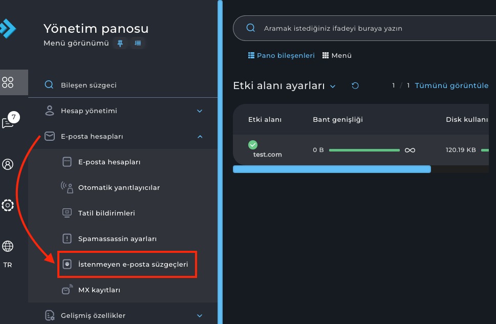 1 – Yönetim panosu üzerinden E-posta hesapları (E-mail Manager) > İstenmeyen e-posta süzgeçleri (SPAM Filters) kısmına giriniz.