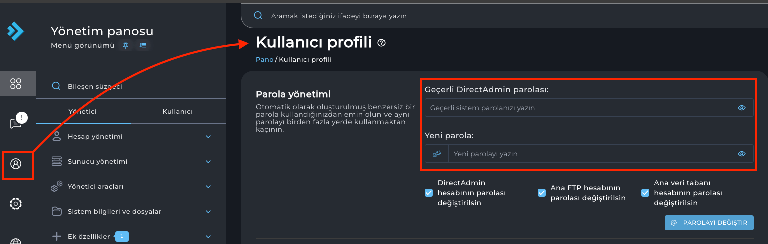 - Reseller sahibiyseniz ve ana kullanıcı hesabınızın parolasını unuttuysanız bu işlem için destek talebi oluşturmanız gereklidir. Fakat şifrenizi biliyorsanız ve güncellemek istiyorsanız aşağıdaki adımları takip ediniz.