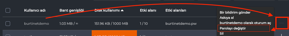 2- Şifresini değiştirmek istediğiniz kullanıcı hesabının sağında yer alan + iconuna basınız ve Parola Değiştir seçeneğinden kullanıcı hesabının şifresini değiştirebilirsiniz.
