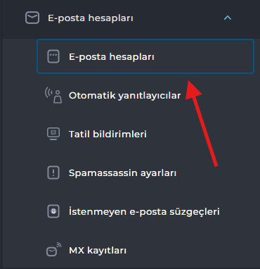 Yönetim panosu üzerinden E-Posta hesapları bölümünün altında yer alan E-posta hesapları kısmına tıklayın.