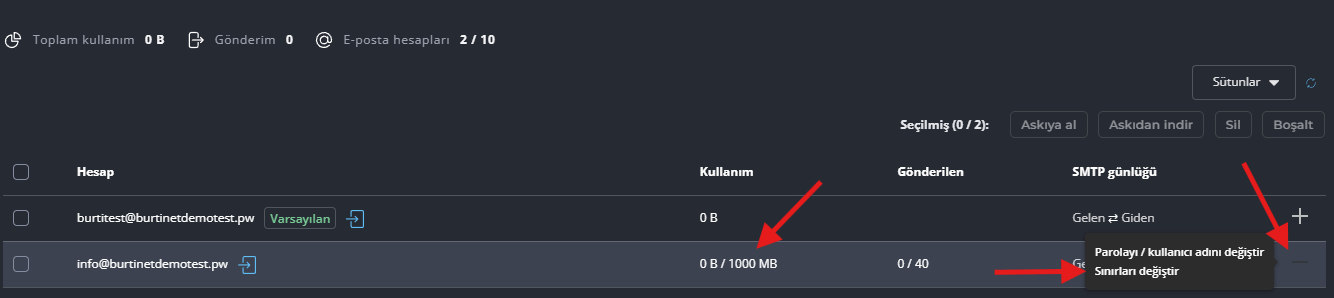 Disk alanını yükseltmek istediğiniz mail adresinin sağ tarafında yer alan + ikonuna tıklayın ve açılan pencereden Sınırları değiştir seçeneğine tıklayınız.