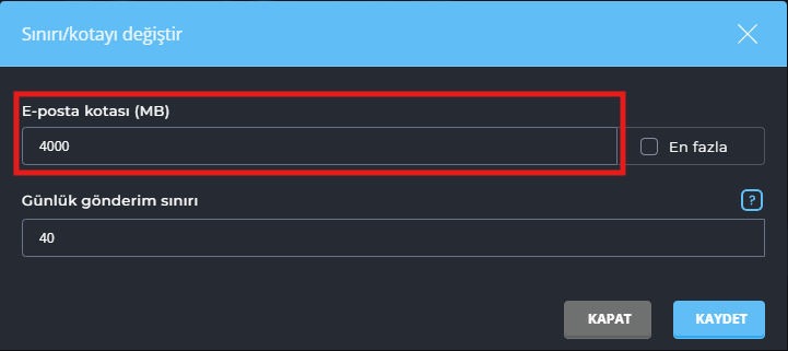 Açılan pencereden E-posta kotası (MB) bölümüne yeni belirlemek istediğimiz disk alanını giriyoruz. İsterseniz En fazla seçeneğini seçip kullanıcıya tanımladığınız disk alanı kadar sınır belirleyebilirsiniz.