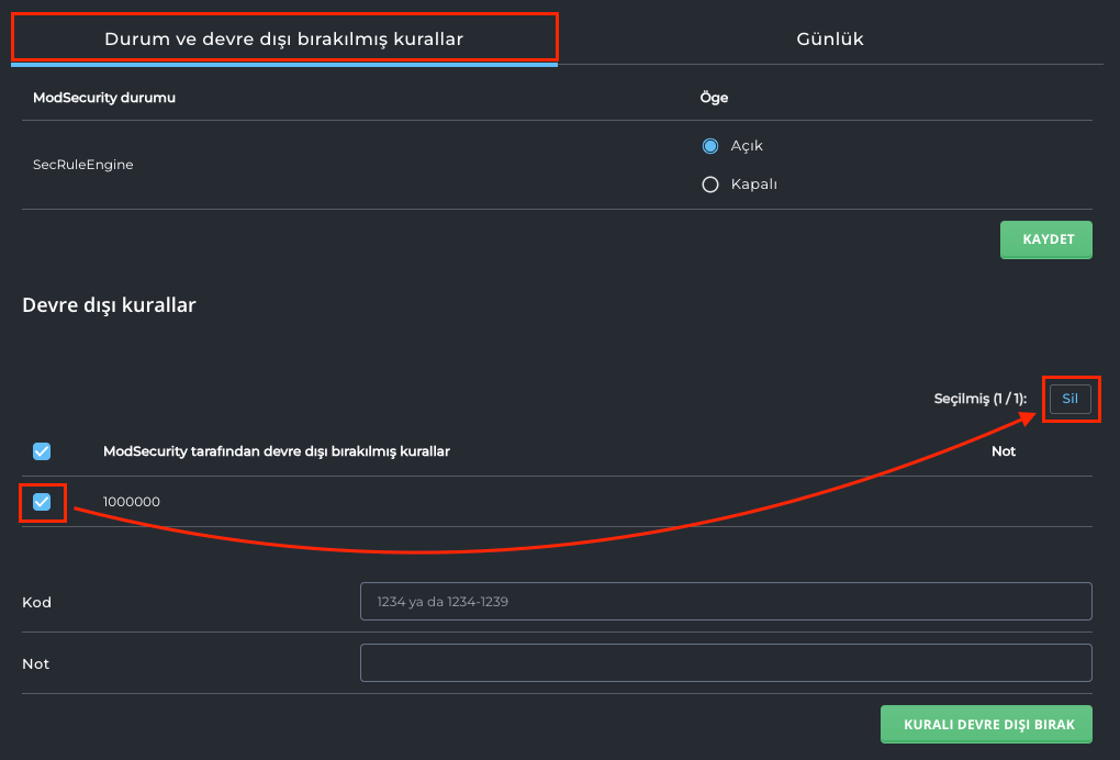 3- ModSecurity Kapalı duruma getirmedende engellenen kuralları pasif duruma getirebilirsiniz. Bunun için Günlük kısmına geçiş yapmalısınız. Günlük kısmını kontrol ettiğinizde yaptığınız işlemleri engelleyen bir kural varsa kuralın sağ tarafında yer alan + iconuna basınız ve Kuralı Atla seçeneğine tıklayarak kuralı devre dışı bırakabilirsiniz.