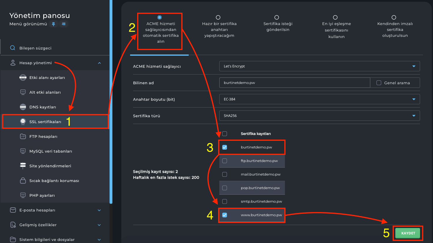 • Menüden SSL Certificates (SSL Sertifikaları) linkine tıklayınız. Görselde yer alan adımları takip ederek SSL kurulumunu gerçekleştirebilirsiniz.