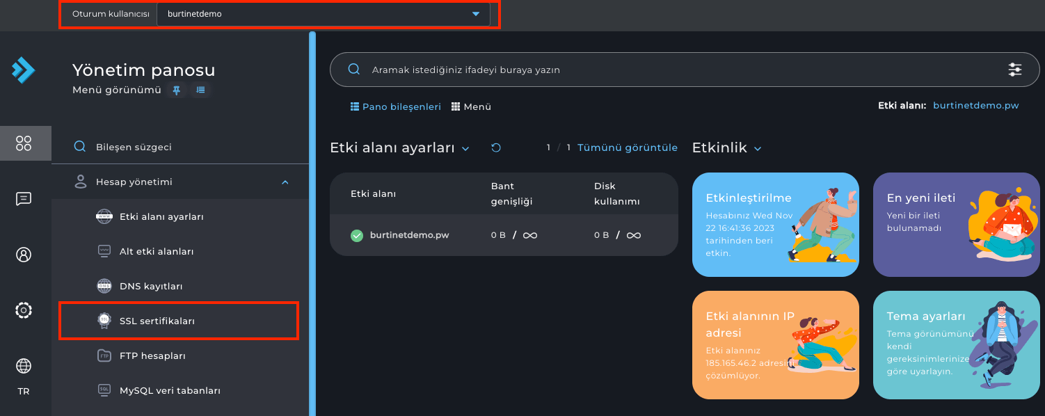 • Hesap Yönetimi > Etki alanı yönetimi > Etki alanınızın üstüne tıklayın > Güvenli SSL kısmını aktif duruma getiriniz. Sonrasında tekrar SSL Sertifika Yönetimi kısmından işlem yapabilirsiniz.