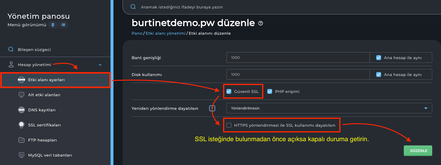 • SSL isteğinde bulunmadan önce HTTP yönlendirmesi ile SSL kullanımı dayatılsın seçeneği aktif ise kapalı duruma getirin.