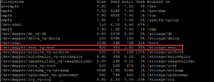 Bu sorunu çözmek için aşağıdaki adımları izleyebilirsiniz. Disk üzerindeki doluluk oranını kontrol etmek için df -h komutunu kullanıyoruz. Bu hatayı /storage/seat alanınızda bulunan depolama alanı azaldığında alırsınız.