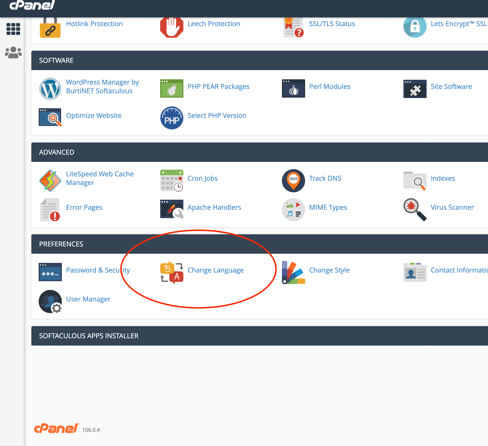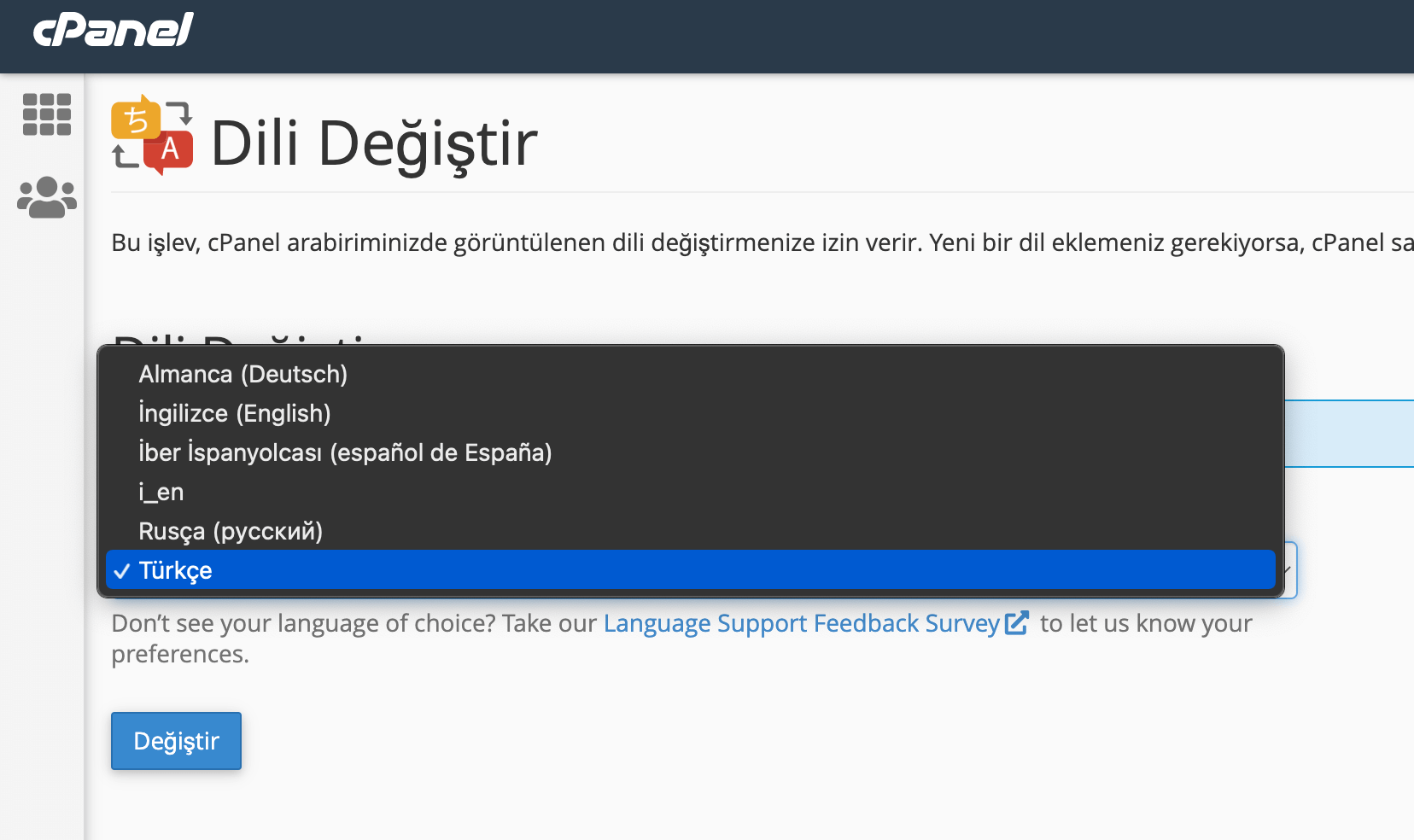 2. Adım: cPanel’de yer alan Change Language alanına tıklayınız: